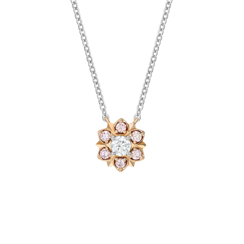A round brilliant-cut white diamond is surrounded by a floral halo of stunning Argyle pink diamonds. Set on an 18ct white gold chain, the Nina exudes subtle sophistication that’s sure to make an impression.