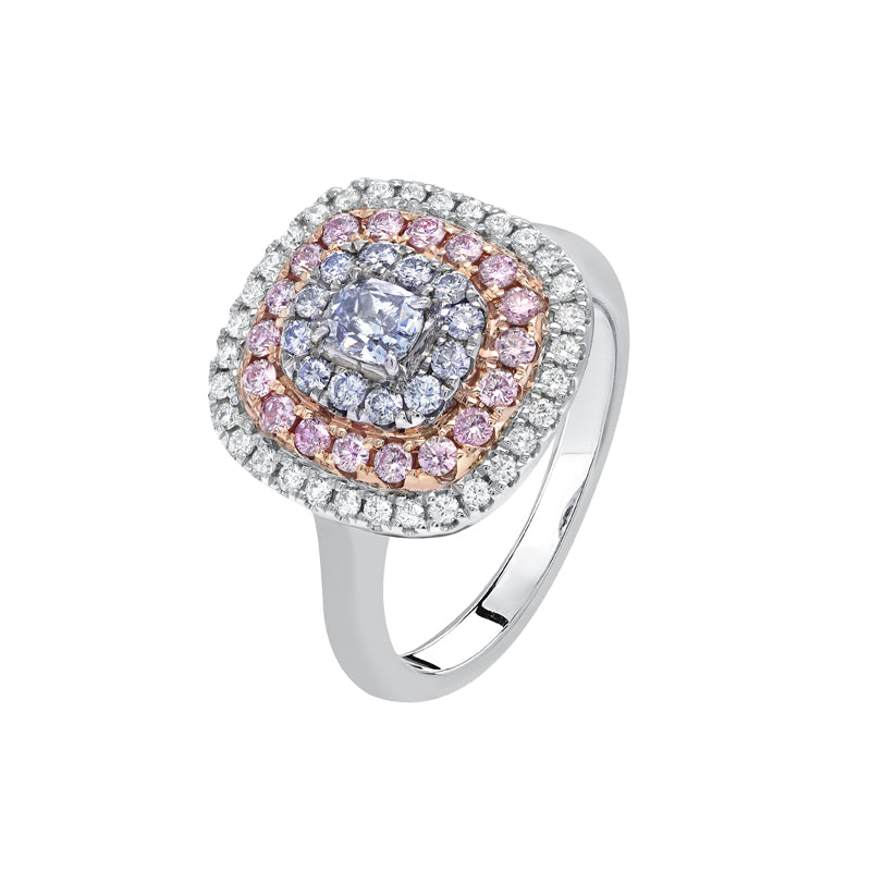 A majestic ring featuring superb natural Argyle blue and pink diamonds set within an elegant cushion shape. This piece is bold and beautiful, truly a statement ring or beautiful engagement ring.