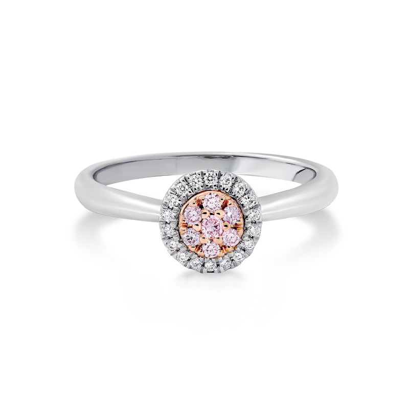 The Blush Eloise Ring is classic and wearable, displaying a petite cluster of fancy light pink diamonds in a circle, surrounded by a sparkling halo of white diamonds. This ring is the lovely everyday ring, or the perfect engagement ring, capturing the rare luxury of Argyle diamonds, and has been crafted in 18ct white and rose gold.