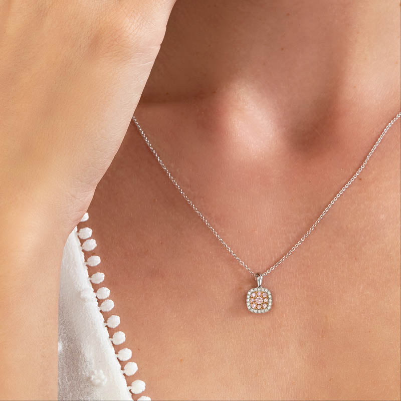 Elegant and wearable, the Blush Princess Thea Necklace features a cluster of fancy light pink diamonds set in a square shape, surrounded by a halo of sparkling white diamonds. This necklace is the perfect way to add a rare, luxurious touch to your daily style, set it 18ct white and rose gold.