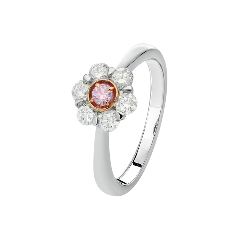 Elevate your jewellery style with the Kimberley Peony Ring – a luxurious ring featuring a rare Argyle pink diamond encircled by a halo of white diamonds, all meticulously set in 18ct rose and white gold, arranged in a floral design. This enchanting, sparkly ring will add a sophisticated, refined elegance to any outfit, perfect for both daytime glamour and evening allure.