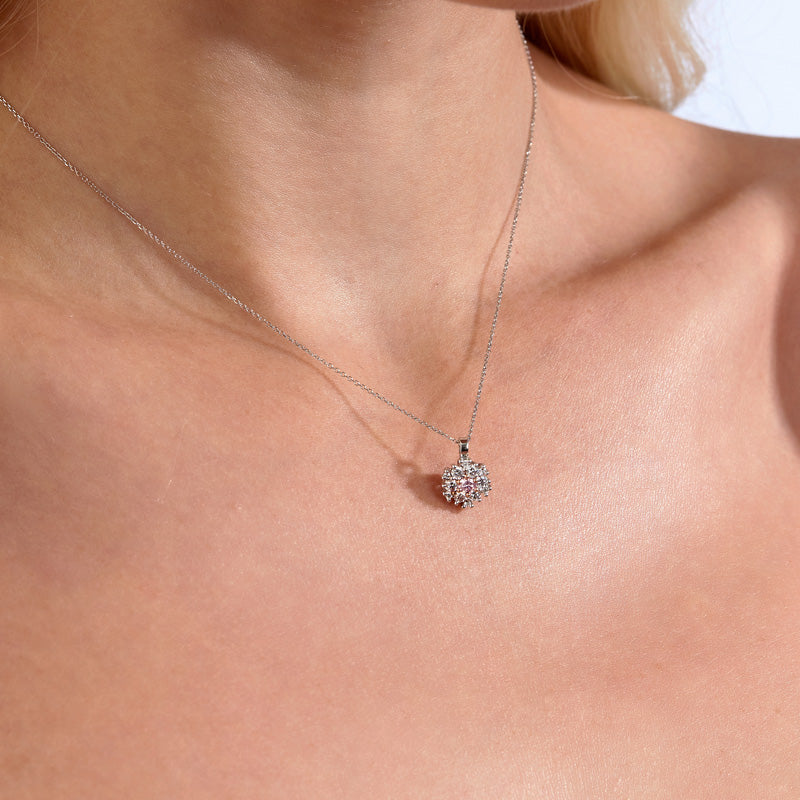 Sparkling and stylish, the Kimberley Starflake Necklace displays a single pink diamond from the Argyle mine in Western Australia, surrounded by a delicate, floral arrangement of beautiful white diamonds. This necklace has been crafted in 18ct white and rose gold.