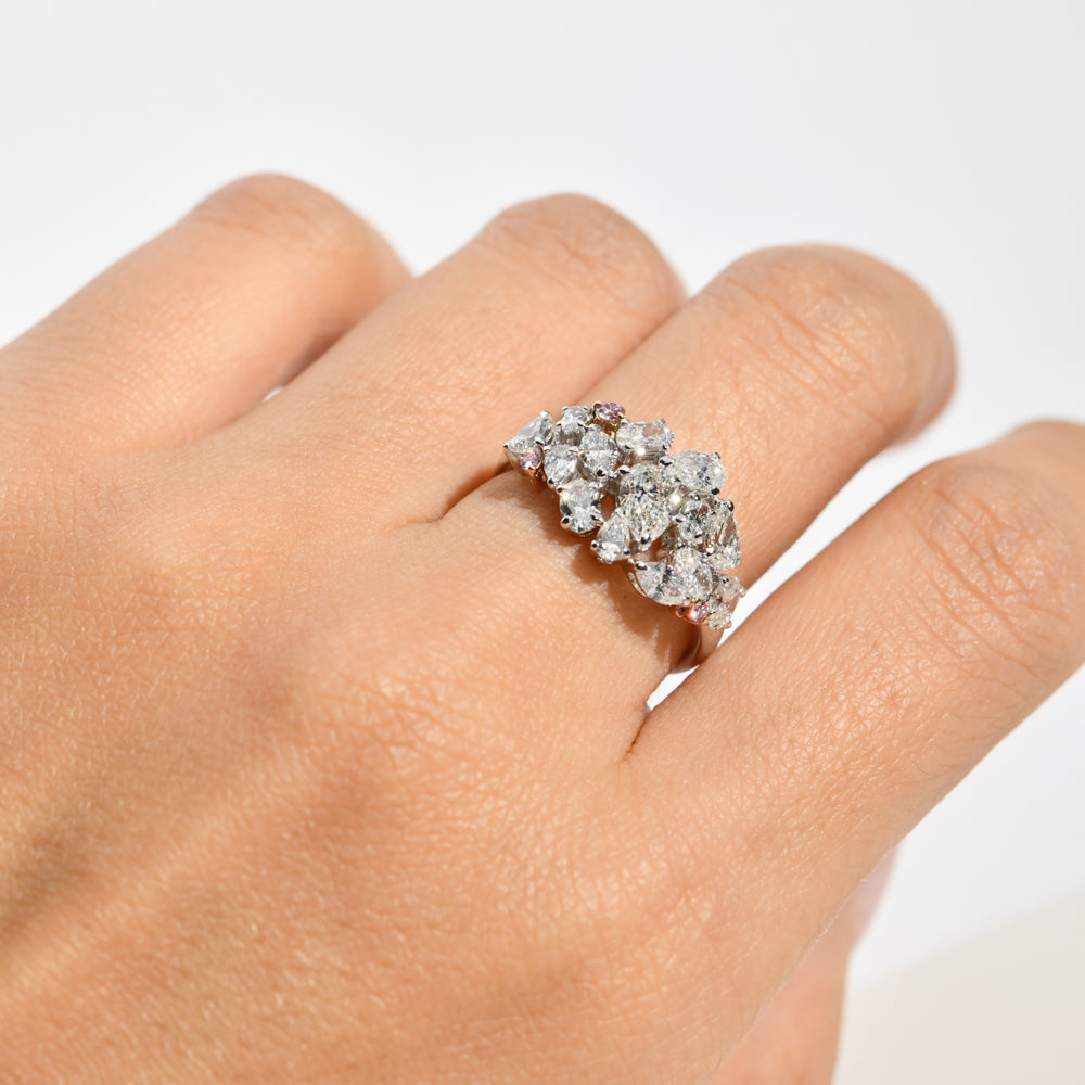 The Kimberley Clarisse Ring is a bold yet refined expression of elegance, featuring a shimmering mosaic of mixed-cut white diamonds accented by rare Argyle pink diamonds. Set in 18ct rose and white gold, its sculptural form exudes glamour from every angle. Crafted with precision and brilliance, this radiant piece celebrates both rarity and craftsmanship.