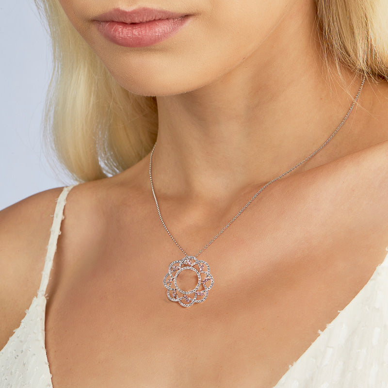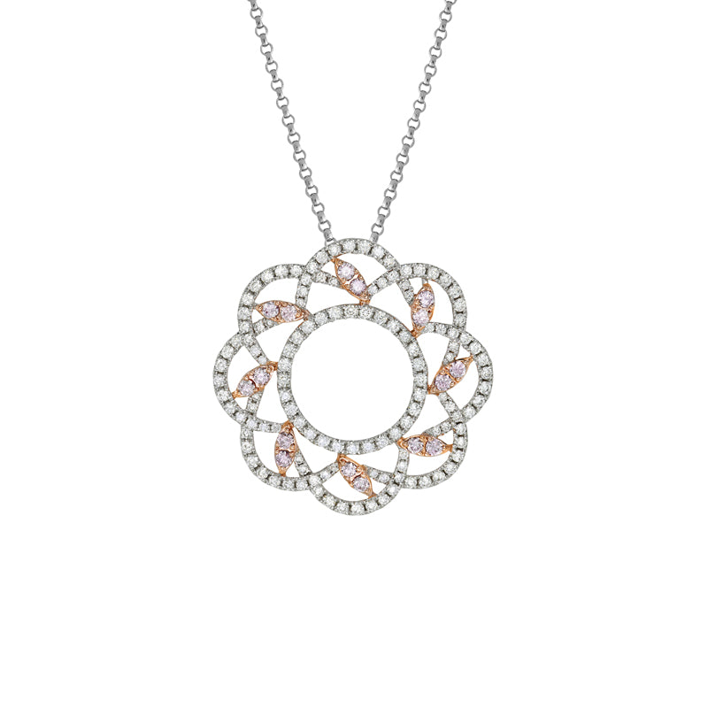 The Kimberley Veronica Necklace is a radiant expression of modern artistry, featuring a floral-inspired motif in 18ct rose and white gold. Rare Argyle pink diamonds are delicately woven among a brilliant display of white diamonds, forming a graceful, openwork design. Suspended from a white gold chain, this captivating piece blends timeless beauty with natural rarity.