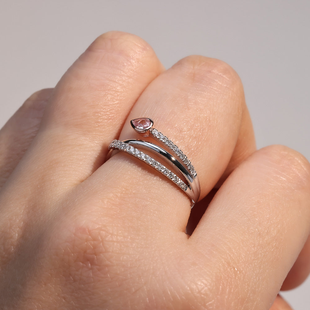 Graceful and distinctive, the Kimberley Prima Ring features a rare Argyle pink diamond in an elegant pear-shaped cut, delicately poised above twin rows of brilliant white diamonds. Crafted in 18ct rose and white gold, this refined design flows with effortless sophistication. A tribute to individuality and timeless beauty, this radiant ring embodies both rarity and artistry — a captivating treasure to cherish