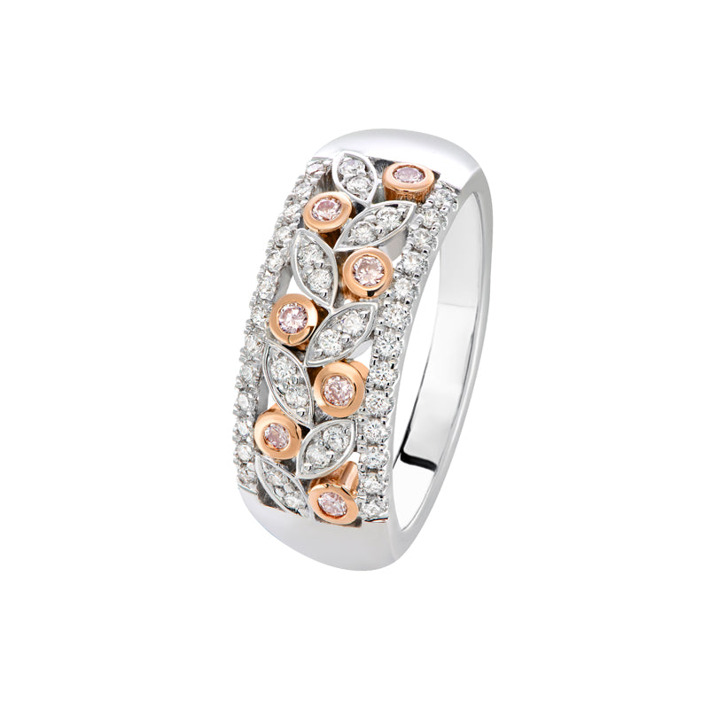 The Blush Pink Lara ring is stylish and unique. This piece showcases a floral arrangement of white and pink diamonds set between two bands of white diamonds. This ring has been crafted in 18ct white and rose gold and reflects the rare beauty of pink diamonds from the Argyle mine.