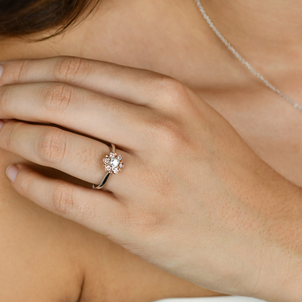 The Blush Nina Ring showcases a single white diamond, surrounded by six stunning fancy light pink diamonds set within delicate rose gold petals. This elegant design is stylish and wearable, encapsulating the rare beauty of Australian pink diamonds from the now closed Argyle mine.